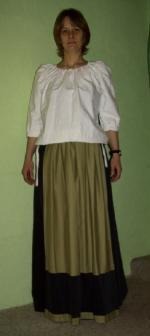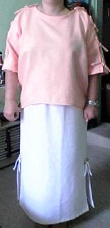 Oberteil 100% Leinen,lachsfarben, beide Ärmel werden mit Bändern zusammengehalten, unterer Bund halbrund geschnitten Rock 100% Leinen, weiß, mit Gummizug, an beiden Seiten mit Schlitz, darüber jeweils ein Holzknopf