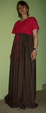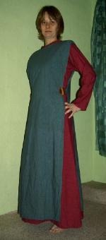 mittelalt. Kleid:rot/ tannengrün, 100% Leinen, zweiteilig, 2 große Holzknöpfe auf beiden Seiten